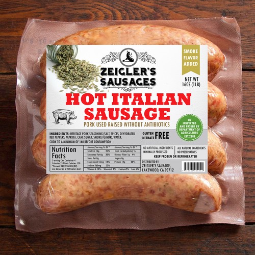 Design a sleek new product label for Zeigler's Sausages Product label